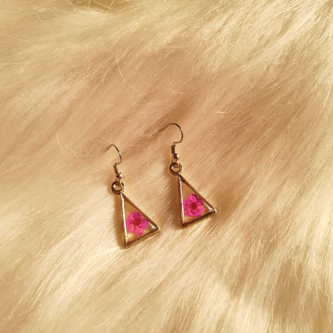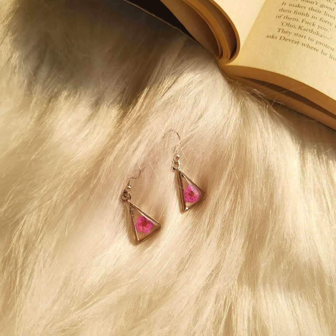 A modern take on nature’s softness, these earrings feature real blossom flowers preserved within a sleek triangular silhouette. The clean geometric shape contrasts beautifully with the delicate petals, creating a look that is both minimal and refined.